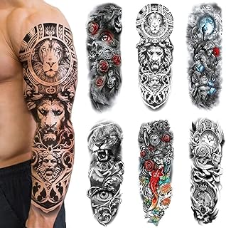 Feelairy 6 Feuilles Tatouages Temporaires pour Homme Femme, Grand Tatouages Tattoo Manchette Étanche Bras Complet Autocollant Body Tattoo Sticker Tatouages Éphémères, Tigre, Lion, Loup